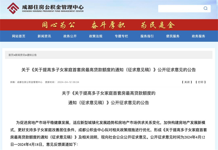 发布人:转载自成都高新 发布时间:2024-04-16近日,成都住房公积金管理中心发布了《关于提高多子女家庭首套房最高贷款额度的通知(征求意见稿)》。