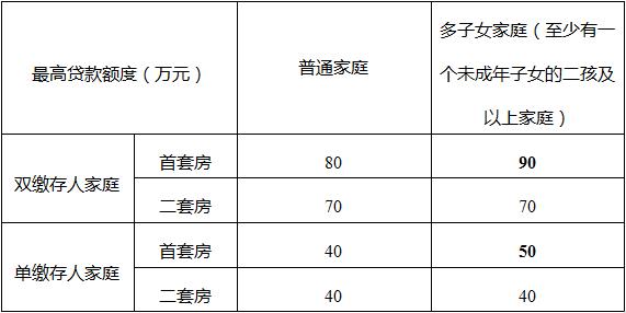 符合住房公积金贷款条件的多子女家庭,在我市购买首套住房的,双缴存人家庭最高贷款额度从80万元调整为90万元,单缴存人家庭最高贷款额度从40万元调整为50万元。